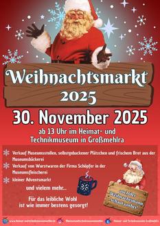 Am 1. Advent lädt das Heimat- und Technikmuseum herzlich zum traditionellen Weihnachtsmarkt ein - stimmungsvoll, regional und voller besonderer Attraktionen für die ganze Familie. Zwischen festlich geschmückten Ständen, weihnachtlichen Klängen und köstlichen Düften wartet wie jedes Jahr ein liebevoll gestaltetes Programm für kleine und große Besucher.