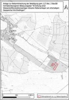 Der Geltungsbereich des vorhabenbezogenen Bebauungsplans „Errichtung einer Wasserstoffproduktionsanlage inklusive Nebenanlagen am ehemaligen Gasspeicher Kirchheilingen“ ist dieser Bekanntmachung als Anlage beigefügt. Der Geltungsbereich des Bebauungsplans schließt sich unmittelbar südwestlich der Ortslage Marolterode an und umfasst eine Fläche von ca. 2,66 ha.