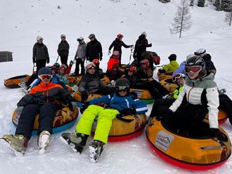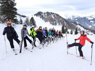 Die neu eroberten Pisten hinab vom Arbiskogel (1830m) boten immer mehr Gefälle, so dass bei der Abfahrt zunehmend „Pommes“ - die Parallelschwungtechnik - erprobt wurde. Mit zunehmender Zuversicht zum eigenen Können steigerten sich auch Spaß und Geschwindigkeit. Wir genossen die „stille Stunde“ zwischen 12 und 13 Uhr in unserem kleinen Skigebiet, wenn andere Skigruppen bereits am Mittagstisch saßen. Auch das Angebot der „Tubing“-Bahn nahmen wir mit Freude wahr. Danach schmeckte das landestypische Menü umso besser.