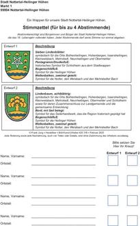 Nutzen Sie dafür den beigefügten Stimmzettel und kreuzen Sie den Wappenentwurf an, der aus Ihrer Sicht unsere Stadt am besten repräsentiert. Eine kurze Beschreibung ist jedem Entwurf beigefügt.