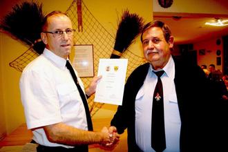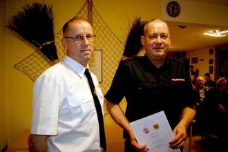 Der Vereinsvorsitzende und zugleich auch Bürgermeister der Gemeinde Joachim Haase (re.) übergibt die Berufungsurkunde zum Zugführer an den Ortsbrandmeister Mario Niemand.