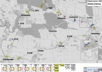 | -> | offizielle Umleitungsbeschilderung über die B 249 Körner - Grabe - Mühlhausen - L 1016 Windeberg - L 2041 nach L 2096 Obermehler - Großmehlra und zurück |