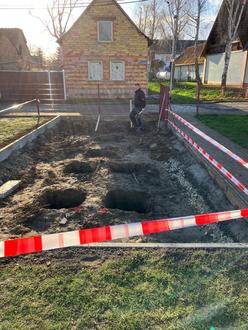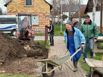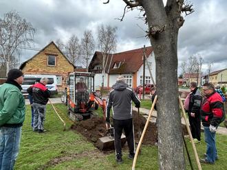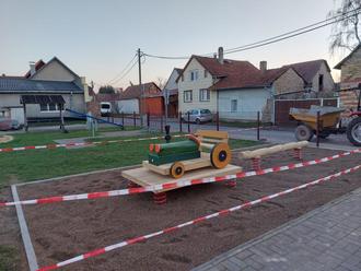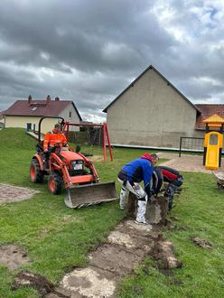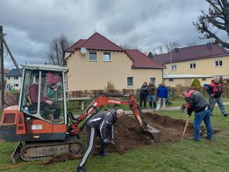 Im Zuge des diesjährigen Frühjahrsputzes wurden durch viele freiwillige Bürger, den Mitgliedern des Dorfclubs, dem Ortsteilbürgermeister und den Mitarbeiter des Bauhofs die aufwändigen Vorbereitungsarbeiten ausgeführt. Mit mehreren durch die Helfer gestellten Baugeräten wurde die Grube des Spielgeräts ausgehoben und Fundamentlöcher geschachtet, Borde gesetzt und die Einfassung betoniert.