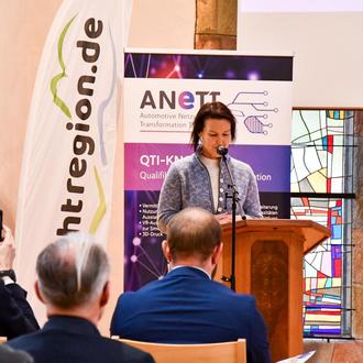 Landrätin Peggy Greiser betont bei der Eröffnung des neuen QTI-Knotens, wie wichtig es für die Region sei, die Automobilindustrie in eine erfolgreiche Zukunft zu führen.