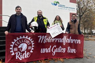Ein besonderer Höhepunkt war die offizielle Scheckübergabe am 6. November vor dem Meininger Landratsamt: Fellows-Ride-Organisator Michael Bader (2.v.l.) überreichte 1.050 Euro an Gesundheitsamtsleiter Alexander Höft (l.), seine Mitarbeiterin Rebekka Frieß (2.v.r.) sowie an Philipp Mell (r.) – und damit stellvertretend an die Regionalgruppe „Verrückt? Na und!“, um die Förderung der mentalen Gesundheit der landkreisweiten Schulen weiter zu forcieren.