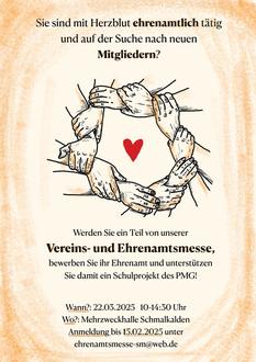 Im Rahmen ihrer Seminarfacharbeit zum Thema „Das moderne Ehrenamt - starker Rückgang oder zunehmendes Engagement?“ organisieren vier Schülerinnen des Philipp-Melanchthon-Gymnasiums Schmalkalden eine Vereins- und Ehrenamtsmesse, bei der verschiedene ehrenamtliche Organisationen und Vereine die Möglichkeit haben, sich den Besuchern vorzustellen, für sich zu werben und neue Mitglieder zu gewinnen. Die Messe soll ähnlich der jährlichen Berufs- und Bildungsmesse in Schmalkalden ablaufen und wird am 22. März 2025 von 10:00 bis 14:30 Uhr in der Mehrzweckhalle Schmalkalden stattfinden.