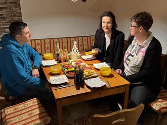 Zu Tisch, bitte: Nico Hannes (l.) und Ehefrau Astrid (r.) luden Landrätin Peggy Greiser zur Verkostung der in Viernau vertriebenen Produkte ein.