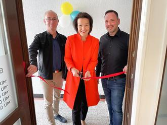 Mit dem symbolischen Durchschneiden des Bandes eröffneten die Geschäftsführer der Kreiswerke Schmalkalden-Meiningen GmbH Torsten Jahns (links) und Thomas Fickel (rechts) gemeinsam mit Landrätin Peggy Greiser das neue Servicebüro des Unternehmensverbundes auf dem Wasunger Markt.