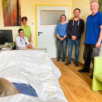 Die in der Zentralen Notaufnahme speziell eingerichteten Behandlungszimmer der sogenannten Senior Unit sollen für ältere Traumapatienten ein vertrautes und beruhigendes Umfeld schaffen. Über die Fertigstellung freuten sich besonders die Chefärztin der Notaufnahme und Geriaterin Dr. Alexandra Finn (links) und Schwester Katrin Ewert. Constanze Wohlfahrt (Mitte), Sebastian Luge (IT) und Heiko Schlehahn (Technik) aus dem Projektteam unterstützen Senioren von der Notaufnahme bis zur Entlassung nach Hause.