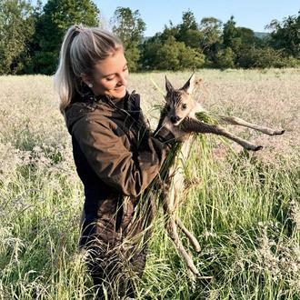 Luisa Schleicher mit einem von neun jungen Rehkitzen, das sich im hohen Gras versteckt hielt.