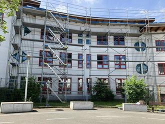 Einbau des Sonnenschutzes und Sanierung der Fassade am Eingangsportal (bis Ferienende).