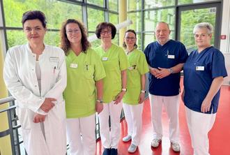 Dr. med. Alexandra Finn, geriatrische Behandlungsleiterin und Chefärztin der Zentralen Notaufnahme am Elisabeth Klinikum, Nicole Weiß, Mitarbeiterin im Sozialdienst, Ellen Eberlein, Physiotherapeutin, Stefanie Wagnitz, Teamleiterin der Ergotherapie (alle MVZ Gesundheitszentrum Schmalkalden GmbH), Dr. med. Andreas Luther, unfallchirurgischer Behandlungsleiter und Chefarzt der Klinik für Orthopädie und Unfallchirurgie des Elisabeth Klinikums, und Nicole Ilgen, Zentrumskoordinatorin des AltersTraumaZentrums am Elisabeth Klinikum Schmalkalden (von links).
