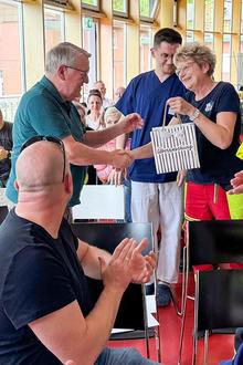 Dr. Susanne Höhn überreicht an Dr. Bamberg, der sich selbst im Ruhestand noch viele Jahre für das Klinikum engagierte, eine Überraschung zum Abschied.