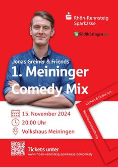 Die Rhön-Rennsteig-Sparkasse und der Stand-up-Comedian Jonas Greiner organisieren am Freitag, den 15. November 2024 zusammen eine Benefizveranstaltung: Den 1. Meininger Comedy Mix. Die Einnahmen der verkauften Tickets werden noch am Abend der Veranstaltung an Vereine und Organisationen aus dem Landkreis Schmalkalden-Meiningen und der Stadt Suhl in Form von Spenden verlost.