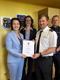 Der Landkreis Schmalkalden-Meiningen hat einen neuen Kreisbrandmeister für den Bereich 3: Mit Wirkung zum 1. Juni 2025 erhielt Herbert Reizlein (3. v. l.) im Landratsamt seine Berufungsurkunde von Landrätin Peggy Greiser (l.). Mit dabei waren auch die Hauptamtliche Beigeordnete Susanne Reich (2.v.l.) und Kreisbrandinspektor Philipp Prenzel (r.), die dem neuen Ehrenbeamten zur Ernennung gratulierten.