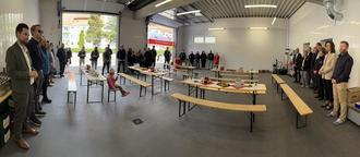 Alle Gäste der feierlichen Dankeschön-Veranstaltung am 23. Mai 2025 versammelt bei der Besichtigung der Fahrzeughalle der neuen DRK-Rettungswache in Steinbach-Hallenberg.