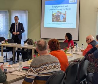 - der Ehrenamtsbeauftragte des Freistaates Thüringen / Staatskanzlei Herr Guntram Wothly referierte zum Thema: Richtlinie zur Umsetzung des Thüringer Ehrenamtsgesetzes mit anschließender Diskussion, am Abend referierte Herr Wothly zu dieser Thematik offen für alle im Roten Ochsen in Schleusingen