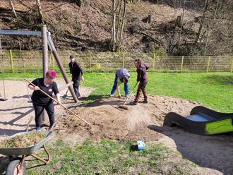 In knapp 2 ½ Stunden waren Spielgeräte gereinigt, Hecken und Sträucher geschnitten, Fahr- und Sandspielzeuge gesäubert, Spielzeughütten und die Fahrbahn gefegt und auch im Haus wurden viele Aufgaben erledigt.
