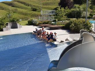 Eine Gruppe aus der Kita Sonnenblume besuchte mit der Erzieherin Frau Möhring das Freibad. Zum Anbaden durften die Füße ins Wasser gehalten werden.