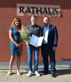 Neben Bürgermeister Heiko Schilling gratulierte auch die Lehrausbilderin Frau Silke Blaurock zum tollen Ausbildungsergebnis. Herr Schilling überreichte Herrn Sittig das Zeugnis sowie einen unbefristeten Arbeitsvertrag. Herr Sittig wird zukünftig in der Kassenverwaltung tätig sein.