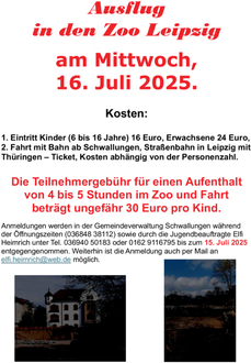 Anmeldungen werden in der Gemeindeverwaltung Schwallungen während der Öffnungszeiten (036848 38112) sowie durch die Jugendbeauftragte Elfi Heimrich unter Tel. 036940 50183 oder 0162 9116795 bis zum 15. Juli 2025 entgegengenommen. Weiterhin ist die Anmeldung auch per Mail an elfi.heimrich@web.de möglich.