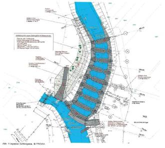 Aus diesem Grund wird die in Abb. 1 dargestellte neue Sohlengleite errichtet, die mehr als doppelt so lang wie das alte Bauwerk und damit entsprechend flacher ist. Die 9 Riegel, die den Wasserstand halten, sind jeweils mit einer Öffnung versehen, durch die die Wanderung der Gewässerorganismen möglich ist.