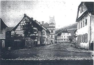 Die Hüttengasse ca. Anfang 20. Jahrhundert - links Haus mit Fachwerkgiebel war das Wohnhaus der Familie Stern