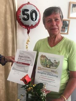 Wenn das 50jährige Jubiläum der Mitgliedschaft im Gesangverein schon auf einen regulären Probenmittwoch fällt, dann sollte man dem auch gleich gedenken. So geschehen am Mittwoch, dem 21. Juni 2023. Sangesfreundin Brigitte Fladung konnte sich über dieses Jubiläum freuen. Vereinsvorsitzende Ingrid Heinrich und Dirigentin Ines Richter gratulierten gebührend. Neben der entsprechenden Vereinsurkunde gratulierte auch der Deutsche Chorverband mit einer Ehrenurkunde und verlieh die Ehrennadel in Gold. Laut Vereinssatzung ist Brigitte nun in den Stand ‚Ehrenmitglied‘ getreten.