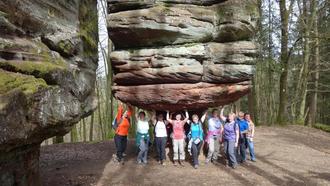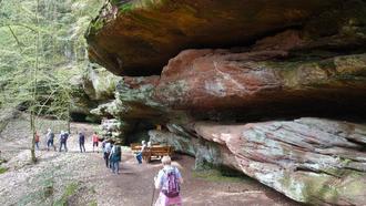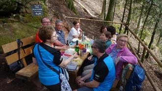 ....wie man wohl heute auf Neudeutsch sagt. Die Wanderführerinnen Brigitte Abel und Karin Bissbort konnten sich am 7. April nicht nur über 18 Wanderer und Wanderinnen freuen, auch das Wetter war ihnen im wahrsten Sinne gesonnen: Bis zu 25 Grad und Sonne satt. Und dann dieser famose Rundweg über 14 Kilometer. Die Felsenwaldrunde bei Pirmasens, ein Wanderweg der Extraklasse. Startpunkt war am Beckenhof, dann gleich zu Beginn schon ein Highlight mit dem Felsentor, danach nicht minder beeindruckend der Gebrochener Felsen und die Schillerwand. Mittagsrast am Wasgau Brünnchen, gefolgt von weiteren außergewöhnlichen Buntsandsteinformationen wie dem Luitpoldfelsen, dem Gebetbuch und dem Kugelfelsen. Immer in einem stetigen Auf und Ab. Dann am Eisweiher vorbei in teils heftigen Anstiegen zur Phillipsruhe, dem Geisen- und dem Kanzelfelsen. Jetzt nur noch am Starkenbrunnen (leider geschlossen) vorbei, einen letzten Anstieg bewältigend und die Wanderschar hatte wieder den Beckenhof erreicht, wo auch der Abschluss der Tour stattfand.