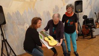 Im Lauf des Abends wurde Walter Fuchs nach 36 Jahren als Vereinsvorstand offiziell verabschiedet und gleichzeitig zum Ehrenmitglied des MGV Höheinöd ernannt. Neben einer essbaren „Tortengitarre“ erhielt Walter Fuchs ein recht umfangreiches Fotobuch über sein musikalisches Wirken. ….in fast vier Jahrzehnten kommt halt auch ganz schön was zusammen. Im Anschluss an die Ehrung stand er dann gleich wieder selbst als Akteur mit seiner neuen Formation „Happy Fox“ zusammen mit Martin Fröhlich und mit Unterstützung durch Alex Resch an den Drums auf der Bühne.