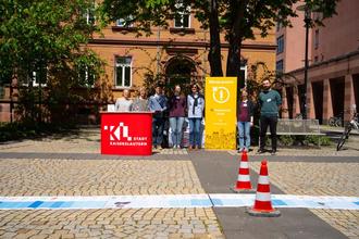 Das knapp 30 Meter lange Bodenbanner war am Mittwoch, den 03. Mai, gemeinsam mit der Bürgerinitiative KlimaLautern und der Stabsstelle Bildung und Ehrenamt auf dem Platz vor dem Pfalztheater ausgerollt worden. Es veranschaulicht mit blauen und roten Jahresstreifen, den sogenannten „warming stripes“, die der britische Klimawissenschaftler Ed Hawkins entwickelt hat, die fortschreitende Erderwärmung seit dem Beginn der Klimaaufzeichungen im Jahr 1850. Die aufgedruckten QR-Codes liefern vertiefende Informationen, wie beispielsweise Kurzfilme oder auch Tonaufnahmen eines abschmelzenden Gletschers.