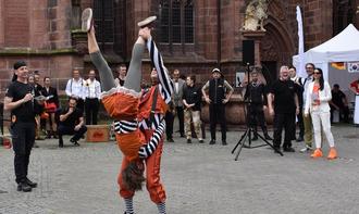 Offiziell eröffnet wurde der Showreigen bereits am Freitagnachmittag durch die Beigeordnete der Stadt, Anja Pfeiffer, und eine Vorstellung aller Künstlergruppen vor der Stiftskirche, woraufhin auch direkt an Ort und Stelle die erste Darbietung durch das Duo Piu o Meno folgte. Schon da war es faszinierend zu beobachten, wie sich innerhalb kürzester Zeit eine Traube von gut 70 Zuschauerinnen und Zuschauer bildete, die das Geschehen verfolgten. „So war es überall, wo die Künstler auftraten“, erzählt Heß. Bei elf Gruppen und fünf Show-Spots gab es immer irgendwo etwas Neues zu sehen. Oder man blieb einfach an Ort und Stelle und schaute sich mehrere der bis zu 50-minütigen Shows hintereinander an.