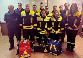 Bürgermeister Felix Leidecker, Wehrleiter Harald Bohl und der stellvertretende Wehrleiter Dominik Klingel bedanken sich bei den ehrenamtlichen Helfern und freuen sich, dass nun wieder im gesamten Holzland qualifizierte Ersthelfer vor Ort sind.