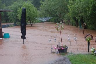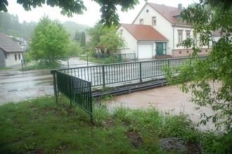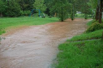 In der Horbacher Ortsmitte hatte sich das sonst kleine Bächlein ebenfalls zu einem größeren Gewässer verwandelt