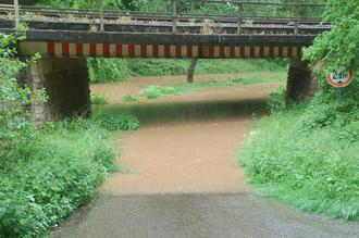 Die Moosalbe erreichte an der Brücke die die beiden Ortsteile von Waldfischbach-Burgalben trennt bis an die Fahrbahnkante