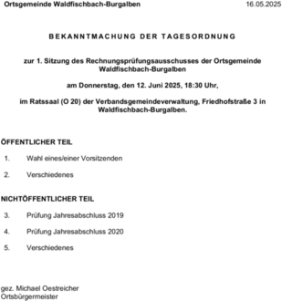 am Donnerstag, den 12. Juni 2025, 18:30 Uhr, im Ratssaal (O 20) der Verbandsgemeindeverwaltung, Friedhofstraße 3 in Waldfischbach-Burgalben.