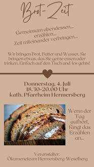 Das Ökumene-Team Hermersberg-Weselberg lädt herzlich ein zur Brotzeit am 4. Juli 2024, 18:30-20:00 Uhr, ins katholische Pfarrheim Hermersberg.