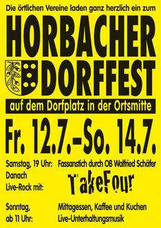 Die Horbacher Vereine laden die Bevölkerung herzlich zum Horbacher Dorffest vom 12. bis 14. Juli 2024 ein. Die örtlichen Vereine haben wieder allerlei kulinarische Köstlichkeiten und kühle Getränke zu familienfreundlichen Preisen für Sie vorbereitet. Am Samstag, den 13. Juli um 19.00 Uhr erfolgt der Fassanstich durch Ortsbürgermeister Walfried Schäfer. Anschließend gibt es Live-Musik von der Gruppe „TakeFour“. Sonntags starten wir ab 10 Uhr mit dem Frühschoppen – ab 12 Uhr haben die Vereine dann verschiedene Mittagessen für sie vorbereitet. Danach gibt es natürlich auch Kaffee und Kuchen.