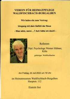 Waldfischbach-Burgalben. Am Freitag, 22. Juli, 19 Uhr, wird der im Verein für Heimatpflege seit Jahren bestens bekannte Diplompsychologe Werner Hübner aus Köln wieder mit einem Vortrag im Heimatmuseum zu Gast sein. Diesmal wird sich der Referent mit dem Thema „Reue“ befassen. An alle interessierten Vereinsmitglieder gleichwie an Gäste ergeht dazu Einladung.