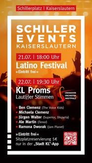 Einen Tag später, am 22. Juli, wartet dann ab 19.30 Uhr mit den „KL Proms“ ein Konzertformat mit Orchester, Band, Chor und Solo-Sängern aus der Region Kaiserslautern auf Musikfreunde, wofür der Schillerplatz mit 450 Plätzen bestuhlt wird. Unter der musikalischen Leitung von Frank Zeihsel und Jochen Messer hat das „Crossover Orchester Westpfalz“ ein vielseitiges Programm mit verschiedenen musikalischen Highlights zusammengestellt. Titel von John Miles, Tina Turner, Robbie Williams, Bon Jovi oder Marc Ronson sind nur einige des abwechslungsreichen Repertoires.