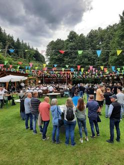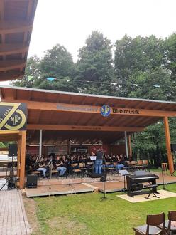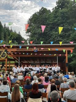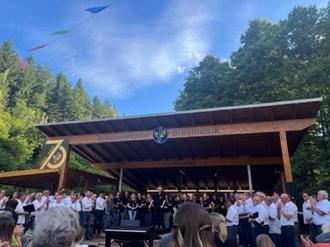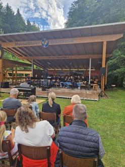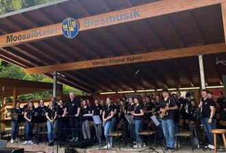 Die musikalischen Gruppierungen des Musikvereins präsentierten sich sowohl einzeln als auch gemeinsam, um das Motto des Konzertes im Jubiläumsjahr „70 Jahre Moosalbtaler Blasmusik“ aufzugreifen. Der Männergesangverein Hermersberg, als Gäste angereist, sang und musizierte als Zeichen der Freundschaft gemeinsam das Stück „Wir Musikanten“. Das Jugendorchester und das Sinfonische Orchester brachte gemeinsam drei Stücke auf die Bühne, wobei zwei davon vom Jugenddirigenten Matthias Schirg und eins davon von Harald Domes dirigiert wurde. Die Stücke wurden zuvor in drei gemeinsamen Proben, auf die man gerne zurückblickt eingeübt. Ein besonderes Ereignis war der Auftritt des Sinfonischen Orchesters mit ehemaligen Musikerinnen und Musikern des Orchesters, die sich hier noch einmal mit viel Freude einbrachten. Zum Abschluss des Open Air bei besten Wetterbedingungen am 7. Juli spielten das Sinfonische Orchester, die Ehemaligen und der MGV Hermersberg den „Egerländer Musikantenmarsch“, was einen tollen Abschluss und einen Höhepunkt des Konzertes darstellte. Insgesamt konnte man an diesem Sonntag die Spätzünder der Moosalbtaler unter der Leitung von Lea Mänges, den Männergesangverein Frohsinn Hermersberg (Leitung Selina Schröer), das Jugendorchester der Moosalbtaler (Leitung Matthias Schirg), sowie das Sinfonisches Orchester unter der Leitung von Harald Domes genießen.