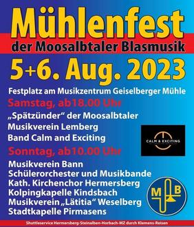 Neben den 2 Getränkeständen gibt es auch unsere Mühlenbar. Alle Stände sind mit Getränken gut bestückt. Samstags gibt es die Eröffnung mit unseren Spätzündern und dann spielt der Musikverein Lemberg. Zum Abschluss kommt wieder die Band „Calm and Exciting“ die auch schon letztes Jahr eine super Show geboten hat. Am Sonntag spielt der Musikverein Bann einen zünftigen Frühschoppen. Dazwischen singt der Katholische Kirchenchor aus Hermersberg. Anschließend spielen unsere Musikbande und das Schülerorchester. Weiter geht es mit dem Musikverein Kindsbach und Lätitia Weselberg. Zum Schluss spielt die Stadtkapelle aus Pirmasens. Im Laufe des Sonntags gibt es dann noch unser Entenrennen und ein Schinkenschätzen. Für unsere Kleinen gibt es neben Kinderschminken auch eine Hüpfburg. Für alle gibt es wieder unser leckeres Kuchenbuffet. Für die zwei Tage ist ein Shuttle Service für Horbach, Steinalben und Hermersberg eingerichtet.