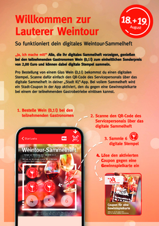 Zu allererst sollte man sich die „Stadt KL“ App auf sein Smartphone laden, die kostenlos für Android- und Apple-Systeme erhältlich ist. Darin ist extra für die Weintour ein digitales Sammelheft integriert, mit dem man bei den teilnehmenden Gastronomen ein Gläschen Wein (0,1 l) zum einheitlichen Sonderpreis von 2,00 Euro bekommt und damit digitale Stempel sammelt. Pro Bestellung von einem Glas bekommt man seinen Stempel durch das Scannen eines QR-Codes, den des Servicepersonal bereithält. Bei vollem Sammelheft wird ein Stadt-Coupon in der App aktiviert, der sich dann gegen eine Gewinnspielkarte bei einem der teilnehmenden Gastrobetriebe einlösen lässt. Zu gewinnen gibt es beispielsweise ein Abendessen, Gutscheine oder auch T-Shirts und Pullover mit der Aufschrift KSRSLTRN.