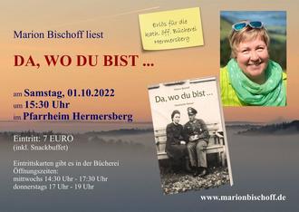 Am 01. Oktober 2022 um 15:30 Uhr findet bei uns im Pfarrhaus eine Autorenlesung mit unserer beliebten Frau Marion Bischoff statt. Sie liest aus ihrem Historischen Roman „Da, wo du bist...“. Eintrittskarten können in der Bücherei für 7 Euro erworben werden. Wie immer gibt es ein gratis Snackbuffet. Der Erlös kommt unserer Bücherei zugute.