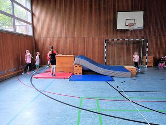 Gleich 20 Kinder hatten Martina Benkel, Abteilungsleiterin Kinderturnen, Janette Utzinger und Dayana Käfer (beide Übungsleiterassistenz) zu betreuen. Hier wurde der Parcours ein wenig schwieriger gestaltet. So wurde aus Zumas Wellen eine lange Purzelbaumstrecke. Die Kinder ab der dritten Klasse bewältigten ihren Bewegungsparcours im Anschluss. Sie übten dann den Abgang vom Kasten mit einer Rolle vorwärts, am Trampolin wurde der Grätschsprung eingeübt. Spaß aber hatten alle Altersklassen an der Station mit den Ringen. Hier mussten alle Altersklassen im Schwingen Kegel mit den Füßen umstoßen.