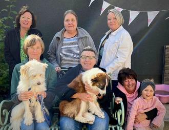 Doris Feick, 1. Vorsitzende - Sabine Gareis, Kassenprüferin, mit Filou - Cornelia Henrich, Schatzmeisterin - Yvonne Refermat, 2. Vorsitzende, mit Grace - Yvonne Müller, Schriftführerin - Andrea Hahn, Kassenprüferin, mit Nachwuchs-Tierschützerin Anni (von links nach rechts)