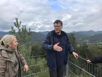 Auf dem Hühnerfelsen hoch über Schwanheim erläuterte Ortsbürgermeister Herbert Schwarzmüller, der mit Bürgermeister Patrick Weißler die Tour geführt hatte, Landrätin Dr. Susanne Ganster den atemberaubenden Ausblick über den Pfälzerwald