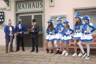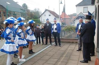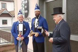 Ebenfalls traditionell bewegte sich der Tross der Narrenschar dann kurz vor dem Termin 11:11 Uhr mit Böllern bewaffnet in Richtung Rathaus, wo es galt Ortsbürgermeister Walfried Schäfer aus den einsturzgefährdeten Gemäuern seines Rathauses zu locken um bei ihm Kasse und Schlüssel zu konfiszieren. Nach einem kräftigen und lautstarken Anklopfen an die Rathaustür öffnete sich diese aber nicht. Vielmehr kam der Ortsbürgermeister zaghaft von außen um die Hausecke und hatte die Kasse unterm Arm um diese der Narrenschar zusammen mit dem Rathausschlüssel zu übergeben. Schwer fiel ihm das nicht, denn die Kasse war erstmalig gähnend leer. Wieder ein Zeichen für die auch hier angekommene Inflation….? Wie OB Schäfer mitteilte will man das Geld dann doch lieber in eine neue Halle investieren.