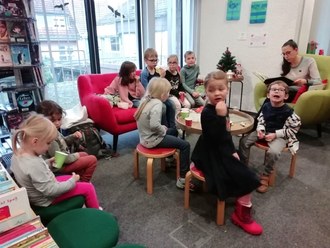 Bei unserer kuscheligen Vorlesezeit mit Frau Hergert am vergangenen Dienstag (21. November) lauschten die Mädchen und Jungen den kurzweiligen Geschichten des Regenbogenfisches, die kleinen Hummel Bommel, einem neu erschienenen Disneyband mit den bekanntesten Geschichten u. a. Anmerkung: Dieses Jahr feiert Disney sein 100-järiges Jubiläum (Sonderausstellung in der Bücherei). In der gemütlichen Runde gab es besonderen Tee, Popcorn und Knabberzeug. Auch Erwachsene lauschten gerne den vorgelesenen Geschichten. Am Ende gab es auf unserem „roten Sofa“ eine extra Kuschelrunde für die Kids. Das Büchereiteam bedankte sich bei Frau Hergert mit einem süßen Präsent für den schönen Vorlesenachmittag.