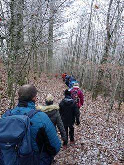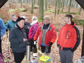 Sonntag, 11. Dezember, auch 3. Advent, plötzlich und unerwartet war er da, der Winter. Mit minus 4 Grad Celsius zauberte er wunderschöne Eiskristalle auf Gräsern und Äste, erforderte aber auch Handschuhe und Ohrschützer. Die 24 Wanderer jedenfalls waren gut gerüstet und folgten Wanderführer Fredi Mänges auf eine knapp 8 km Rundwanderung um den Kumpf. Vom Vereinsheim Am Zimmerkopf ging es erst einmal am Herrgottsbrünnchen vorbei zu einer kurzen Rast am Jäger aus Kurpfalz. Dann Richtung Dinkelstal und unterhalb vom Kumpf auf den Schuhmacherweg. Nun im sanften Anstieg hinauf zum Kreuzstein, allerdings unterbrochen durch eine kurze Trinkpause bei der Jagdhütte. Danach galt es nur noch die wenigen Meter zum HVH Vereinsheim zu bewältigen und die Belohnung wartete auf dem Fuße, Glühwein, Kaffee und Kuchen, sowie lecker Rindswurst, liebevoll angereicht von Eva Eger.